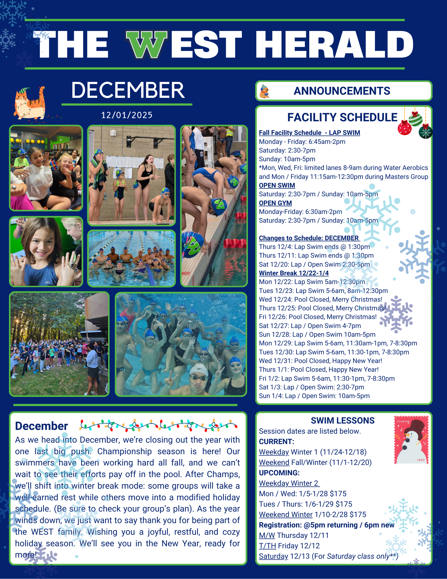 We restructured our Swim School levels for this fall, renaming the groups and adding a precursor to the program to allow for younger swimmers to get a head start on learning to swim. We are also working on a Parent-Lead Clinics for babies, stay tuned for more information to come and read about the rest of our Swim School here: https://www.westswimteam.com/swim-lessons